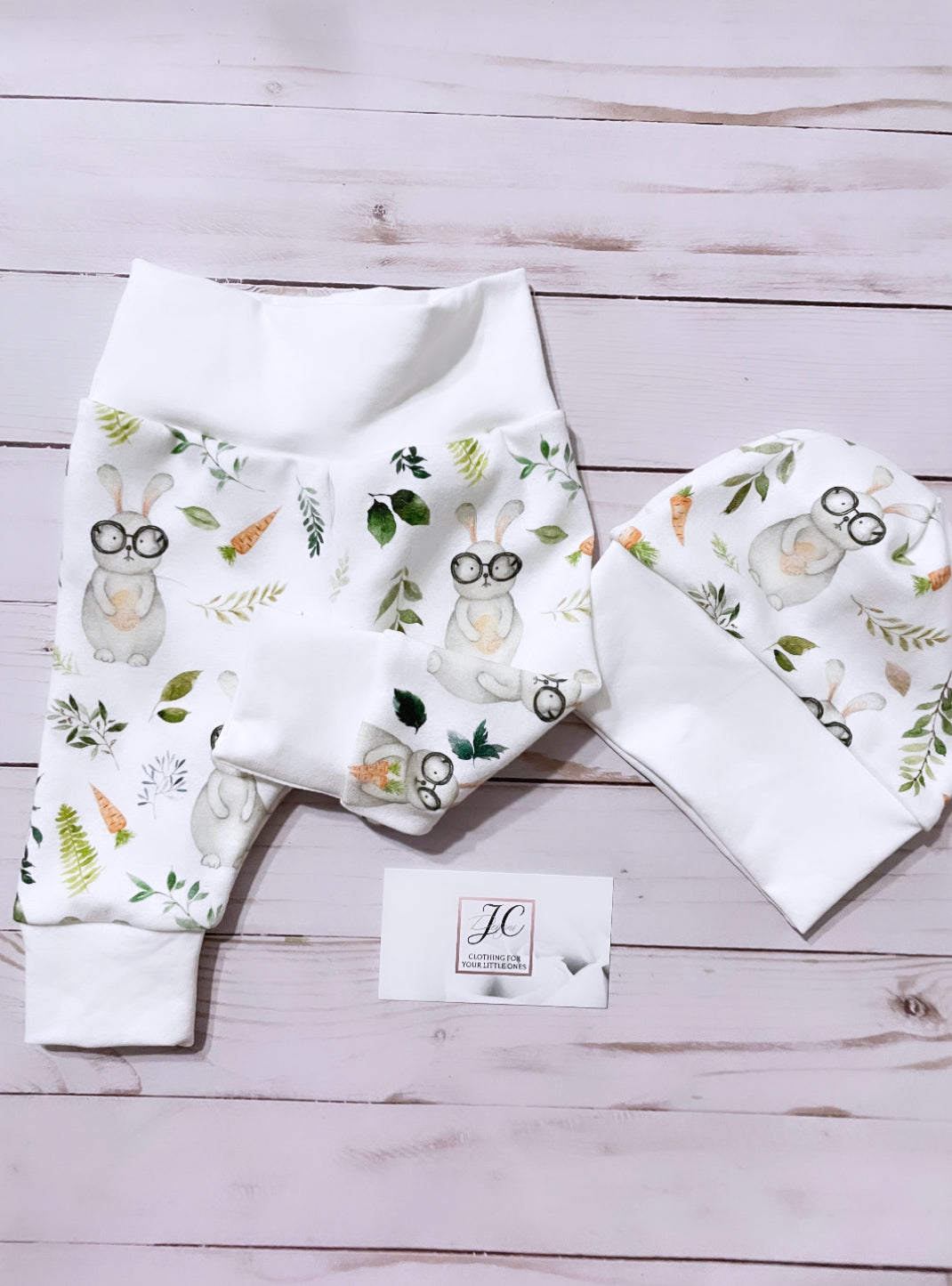 Note: The bands on the hat and pants are an off white and the onesie is a true white so they won’t match exactly