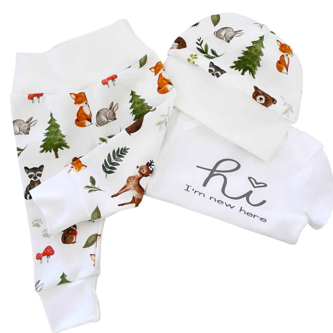 L'imprimé boisé sur le bonnet et les leggings est composé à 100 % de coton biologique, ce qui les rend doux et confortables pour votre tout-petit. Tous nos tissus sont prélavés dans un détergent hypoallergénique et toutes les coutures sont cousues avec une surjeteuse pour plus de durabilité. La taille des leggings est une bande de taille de yoga pour plus de confort et composée à 95 % de coton et à 5 % d'élasthanne pour plus d'élasticité. La bande du chapeau peut être pliée pour une coupe plus petite.