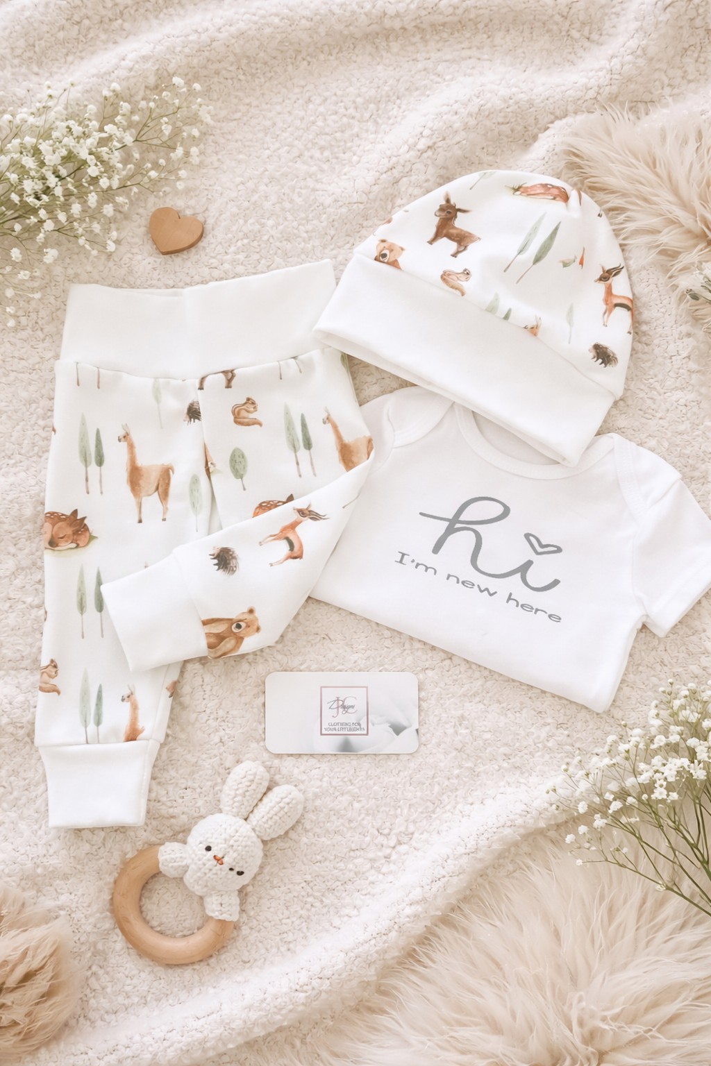 Le mini imprimé animal des bois sur le chapeau et les leggings est fait de coton 100 % biologique, ce qui les rend doux et confortables pour votre tout-petit. Tous nos tissus sont prélavés dans un détergent hypoallergénique et toutes les coutures sont cousues avec une surjeteuse pour plus de durabilité. La taille des leggings est une bande de taille de yoga pour plus de confort et composée de 95 % de coton et de 5 % d'élasthanne pour plus d'élasticité. La bande du chapeau peut être pliée pour une coupe plus petite.