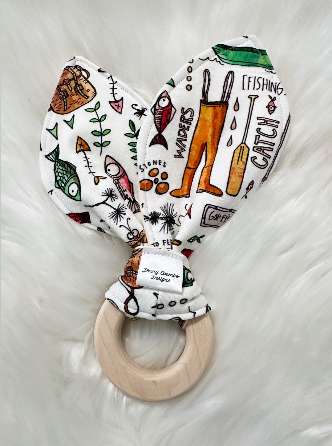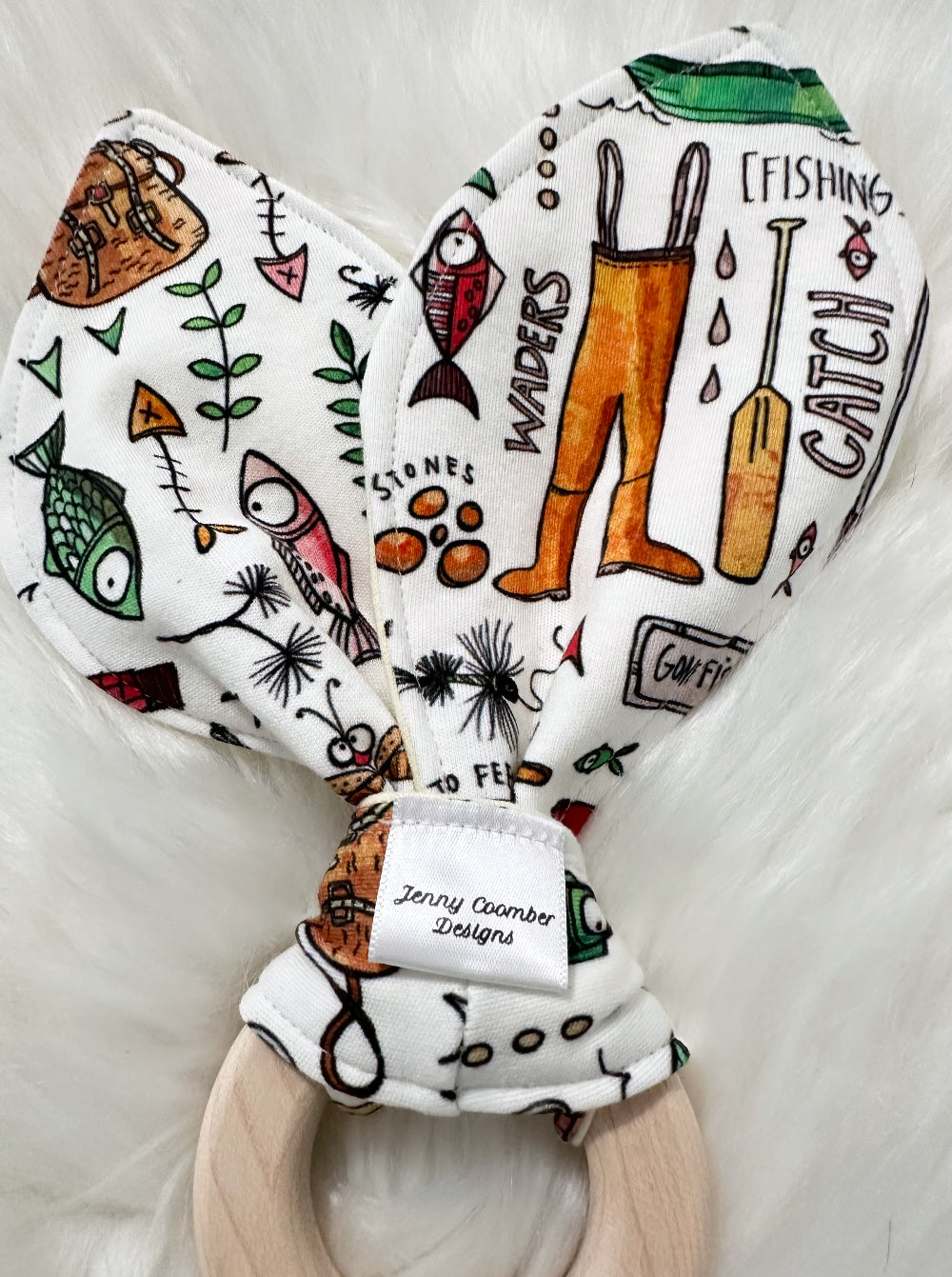 Our “gone fishing” bunny ear Teether is great for soothing gums and sensory play!