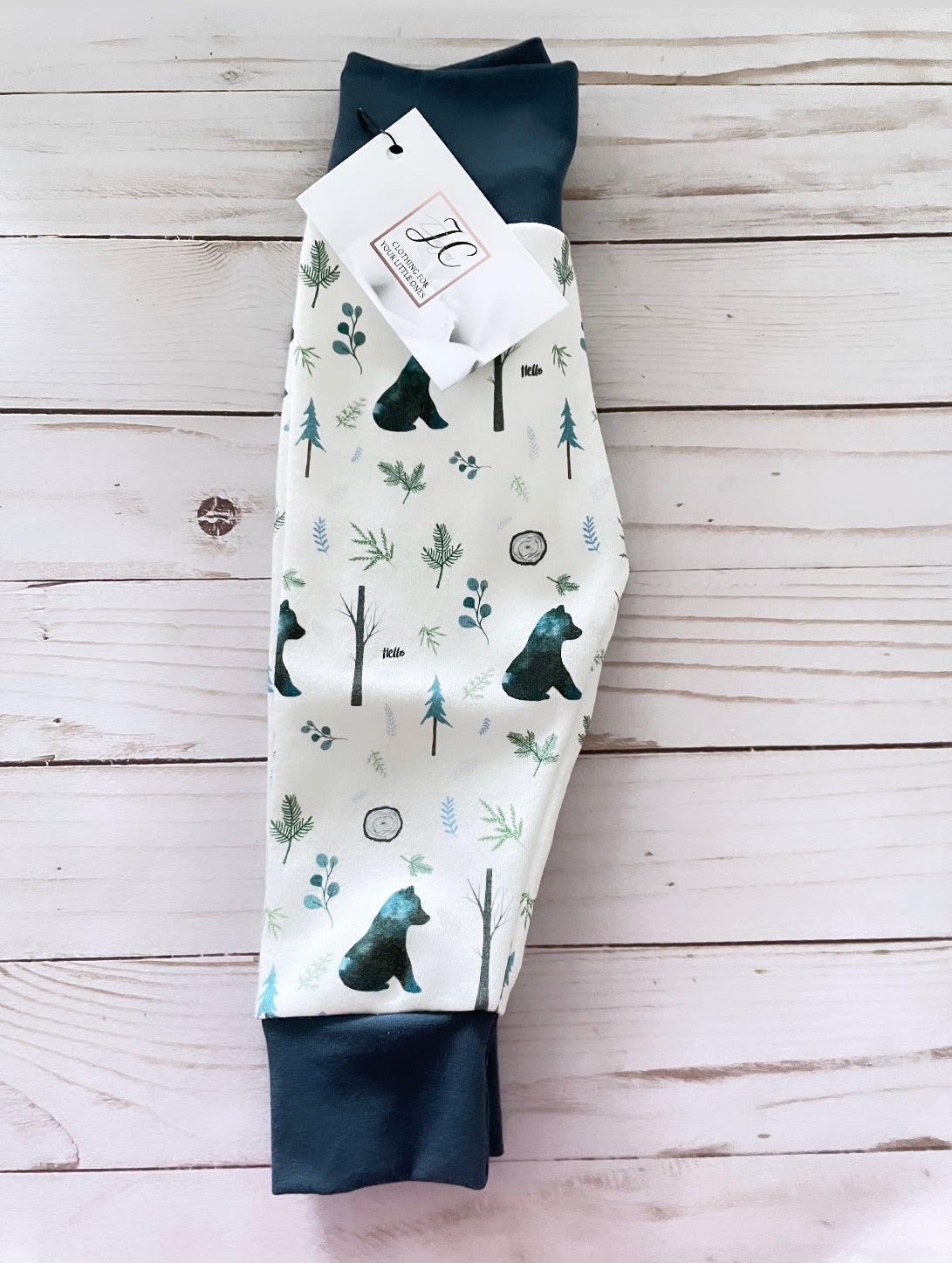 The hello bear print on the leggings is made of 100% organic cotton. which makes them soft and comfy for your little one. All our fabric is pre-washed in hypoallergenic detergent and all seams are sewn with a serger for durability. The waist of the leggings is a yoga waist Band for extra comfort and made of 95% cotton and 5% spandex for stretch.