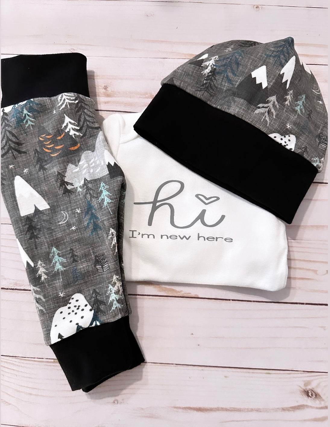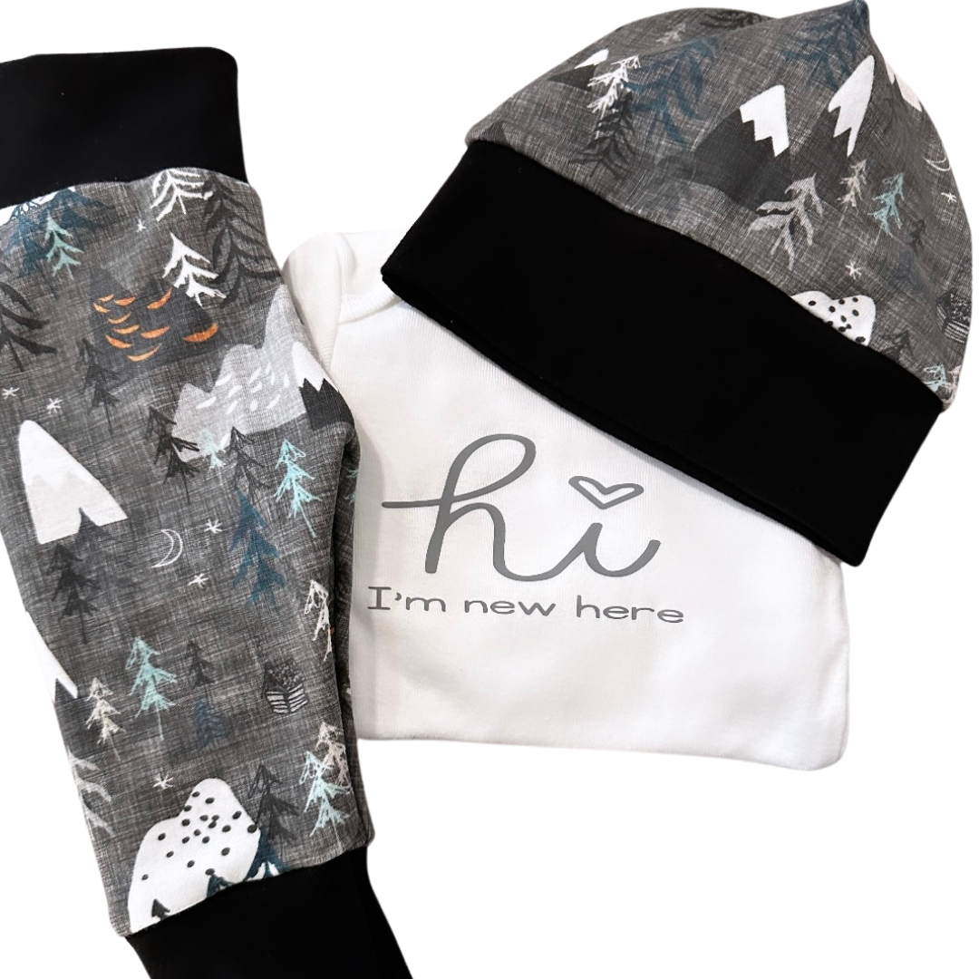The woodland print on the hat and leggings is made of 100% organic cotton. which makes them soft and comfy for your little one. All our fabric is pre-washed in hypoallergenic detergent and all seams are sewn with a serger for durability. The waist of the leggings is a yoga waist Band for extra comfort and made of 95% cotton and 5% spandex for stretch. The hat band can be folded for a smaller fit.